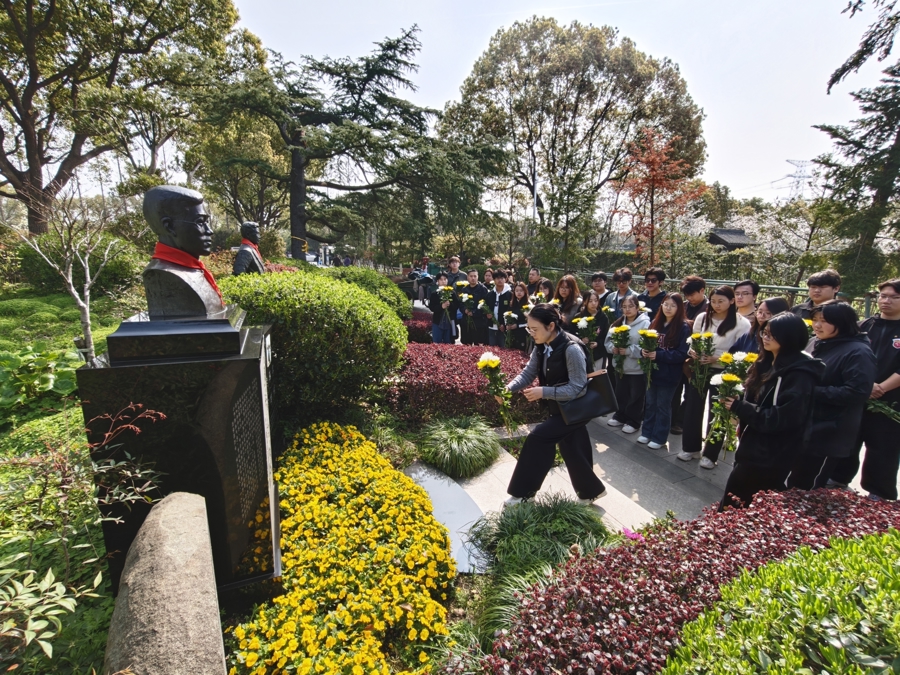 市民来到新四军广场、统战文化广场、勇士长廊、刑警803记挂碑,俞秀松、陈寿昌等义士记挂像前,铭刻历史、牵挂英烈。