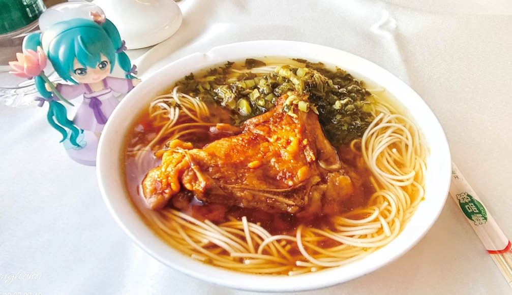 2025年12月27日朝晨,宋来阳在Z100次列车餐车,试吃了厚味的雪菜大排面。受访者供图