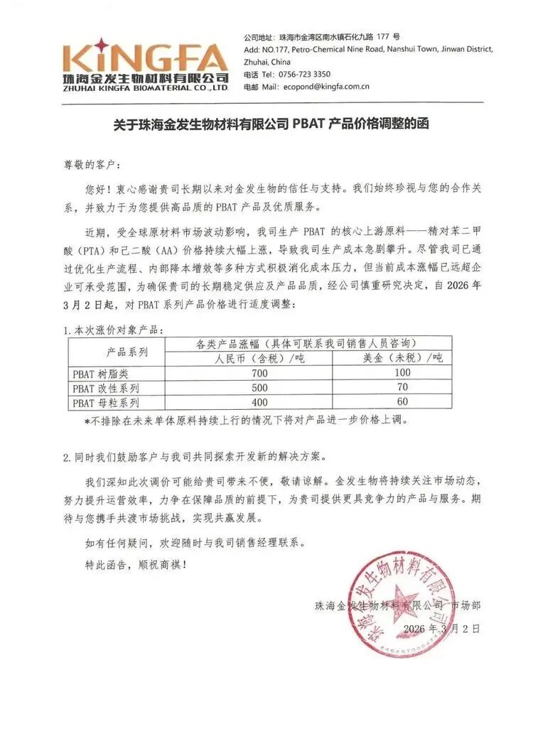 2026年3月2日,珠海金发生物材料有限公司(金发科技子公司)发布PBAT家具价钱改革函,成为行业发展的一个缩影。