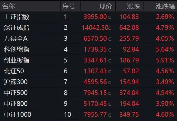 4月8日,A股大幅高开高走,上证指数大涨逾百点,还原3900点并面临4000点大关,深证成指大涨逾4%重回14000点之上,创业板指、科创综指均飙升超5%。超5200只个股高涨,成交急速放大至2.45万亿元,创近1个月新高。