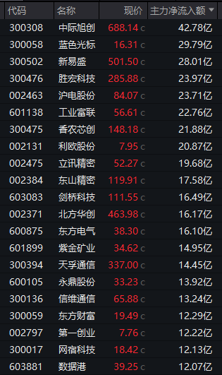 个股方面,中际旭创赢得逾42亿元主力资金净流入,蓝色光标、新易盛、胜宏科技等7股赢得超20亿元净流入,立讯精密、东山精密等17股也赢得超10亿元净流入。