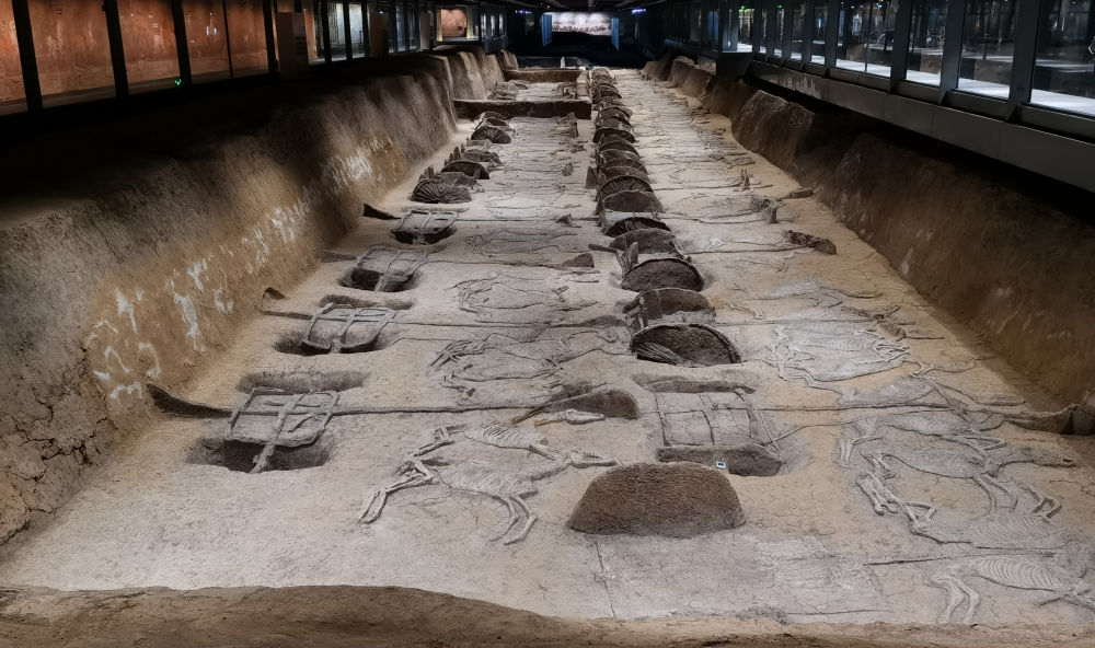 荆州熊家冢国度考古功绩公园一号车马坑出土的车马阵,阵容恢宏。新华社记者 余国庆 摄