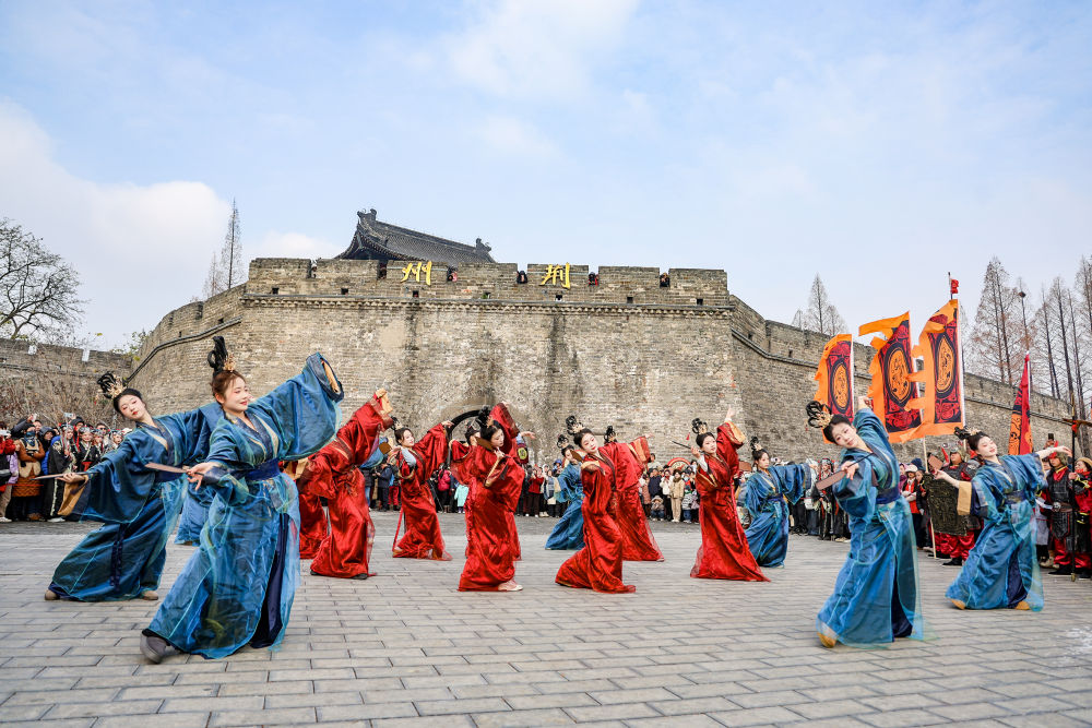“荆州十二时期”入城庆典在荆州古城演出。(张梦瑶 摄)