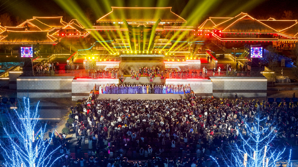 “荆州十二时期·楚乐八百年”在荆州纪南生态文化旅游区演出,再现楚国光线历史。(张梦瑶 摄)
