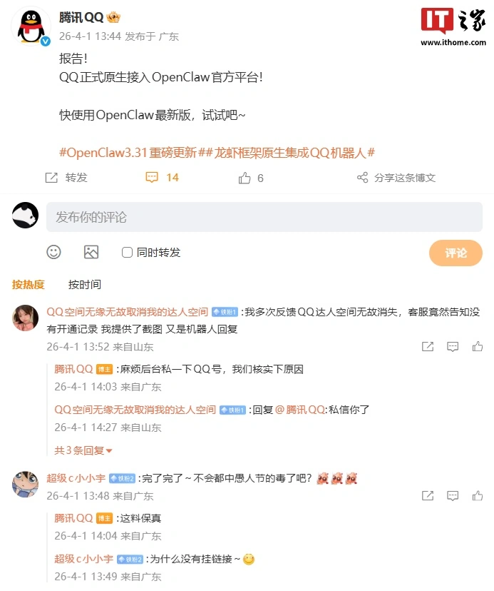 IT之家 4 月 1 日音问,腾讯 QQ 官方微博当天通告,东莞配资网站QQ 讲求原生接入 OpenClaw 官方平台。
