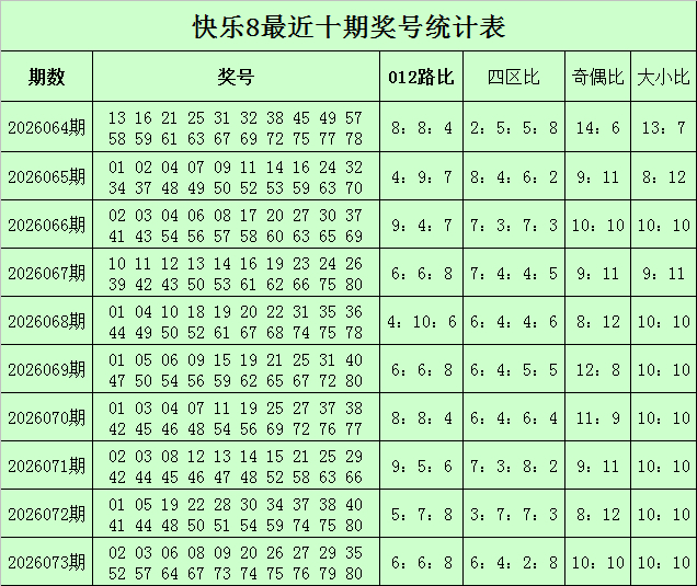 福彩雅瞻念8第2026073期开奖记挂:02 03 06 08 09 20 26 27 29 35 52 57 64 67 73 74 75 76 79 80,其中奖号012路比为6:6:8,四区比为6:4:2:8,奇偶比为10:10,大小比为10:10。