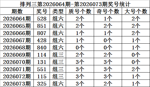 上期讲究:胪列三第2026073期开奖:325,质合比为3:0,奇偶比为1:2,大小比为2:1。