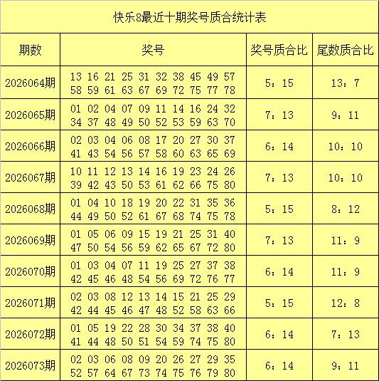 福彩开心8第2026073期开出奖号:02 03 06 08 09 20 26 27 29 35 52 57 64 67 73 74 75 76 79 80,其中奖号质合比为6:14,奖号余数质合比为9:11。